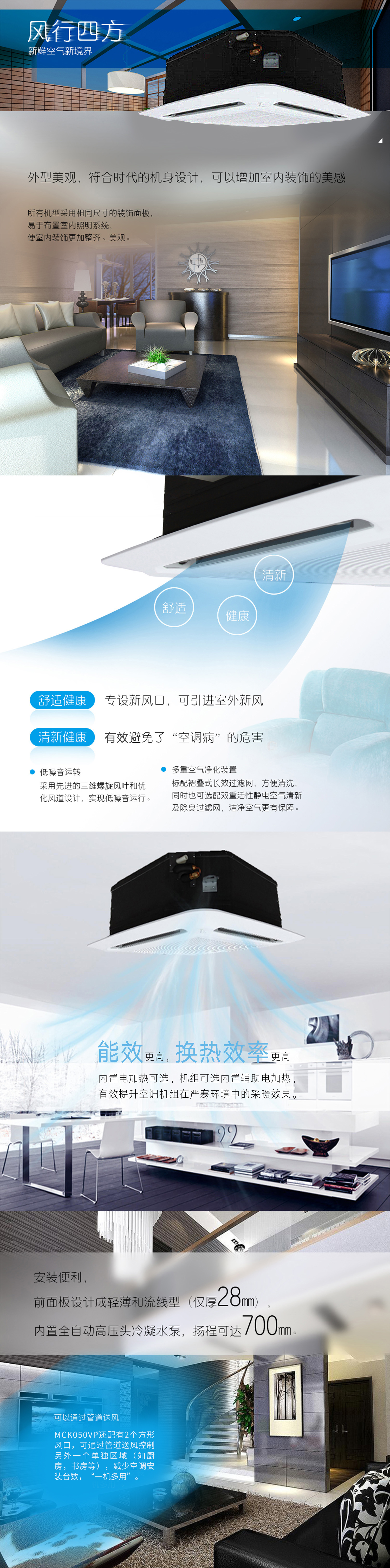 產(chǎn)品理念:新一代環(huán)保系列天花嵌入式空調(diào)機(jī)組,采用先進(jìn)的空調(diào)換氣設(shè)計(jì),并通過(guò)多重降噪處理,集環(huán)保、節(jié)能、靜音、清新、舒適于一身,營(yíng)造一個(gè)自然健康的生活環(huán)境,可時(shí)刻享受清新健康的空氣,擺脫“空調(diào)病”的危害。