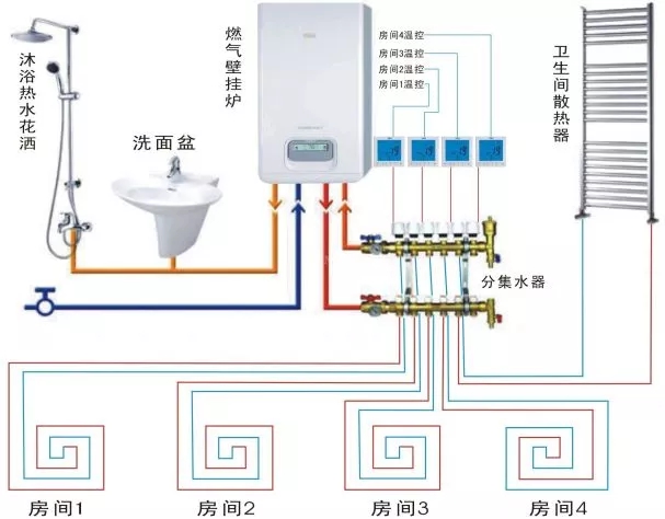 完整的水地暖系統(tǒng)離不開(kāi)熱源、控制、管道、保溫四大部分。采暖壁掛爐是地暖的熱源中心,滿(mǎn)足地暖整個(gè)系統(tǒng)運(yùn)行所需的熱量;保溫層、反射膜、采暖管道、回填層等地面部分保證系統(tǒng)的保溫效果;分集水器和溫控器維護(hù)系統(tǒng)的正常運(yùn)行。